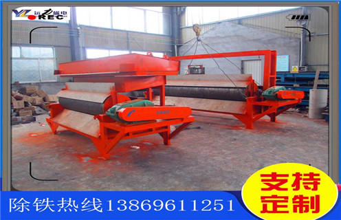 4、含有鐵磁性雜質的物料通過受料斗經電磁振動給料機均勻的下到第一道輸送皮帶上,當物料通過強磁輥時,鐵磁性物質被磁力吸引被吸附到強磁輥上,隨著皮帶的轉動使其從磁場脫離并落入收集斗中。其它物料和沒有選凈的鐵磁性物質隨溜槽進入下一級磁選皮帶進行分選,原理同上。最后選出合格的產品。